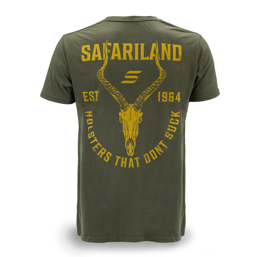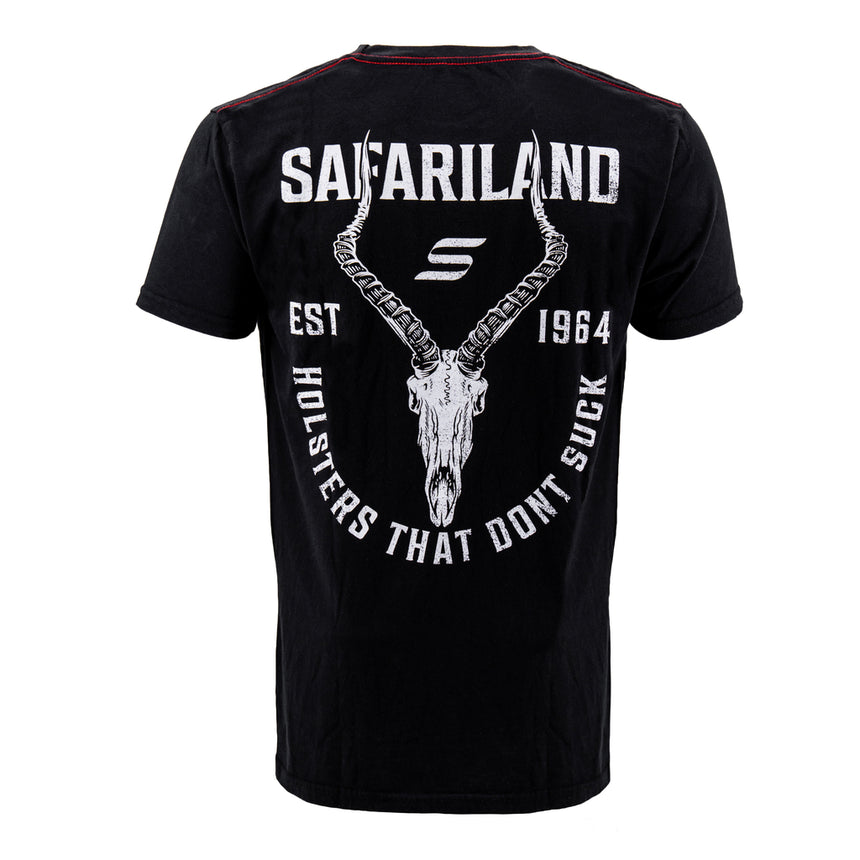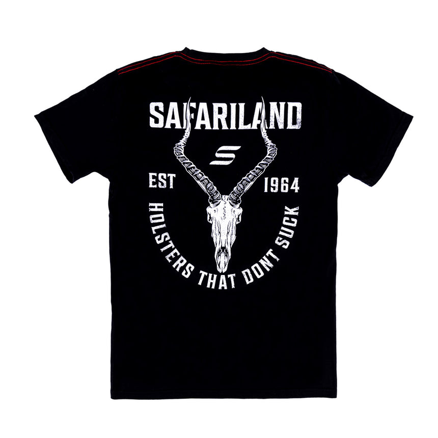 Built for those who demand quality and performance, the Safariland Impala Skull Tee delivers a bold look with serious comfort. The back features a striking impala skull graphic, the Safariland logo, and the statement "Holsters That Don’t Suck"—a nod to those who know the difference between good gear and great gear. The front keeps it clean and understated with the Safariland "S" logo, making it a versatile piece for the range, the job, or everyday wear.